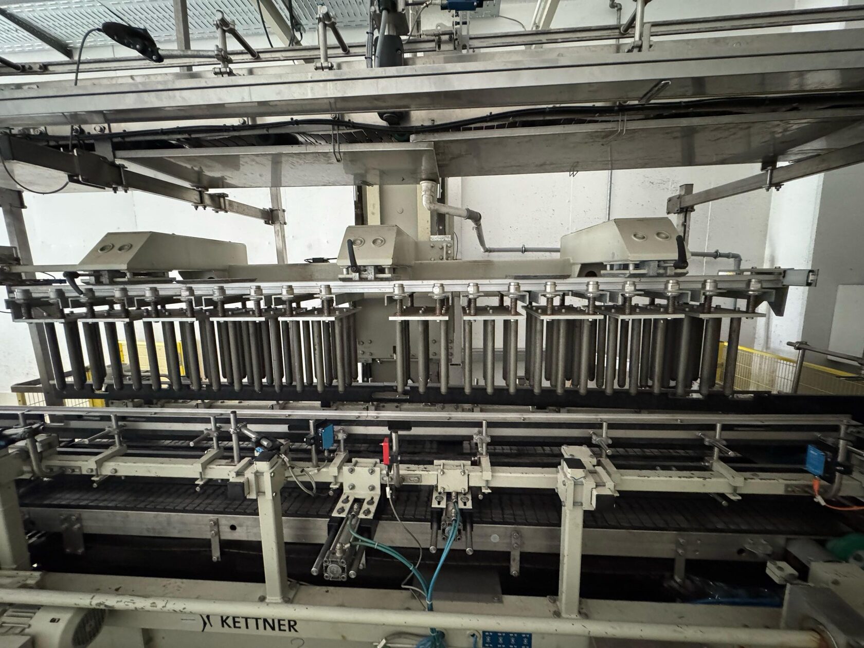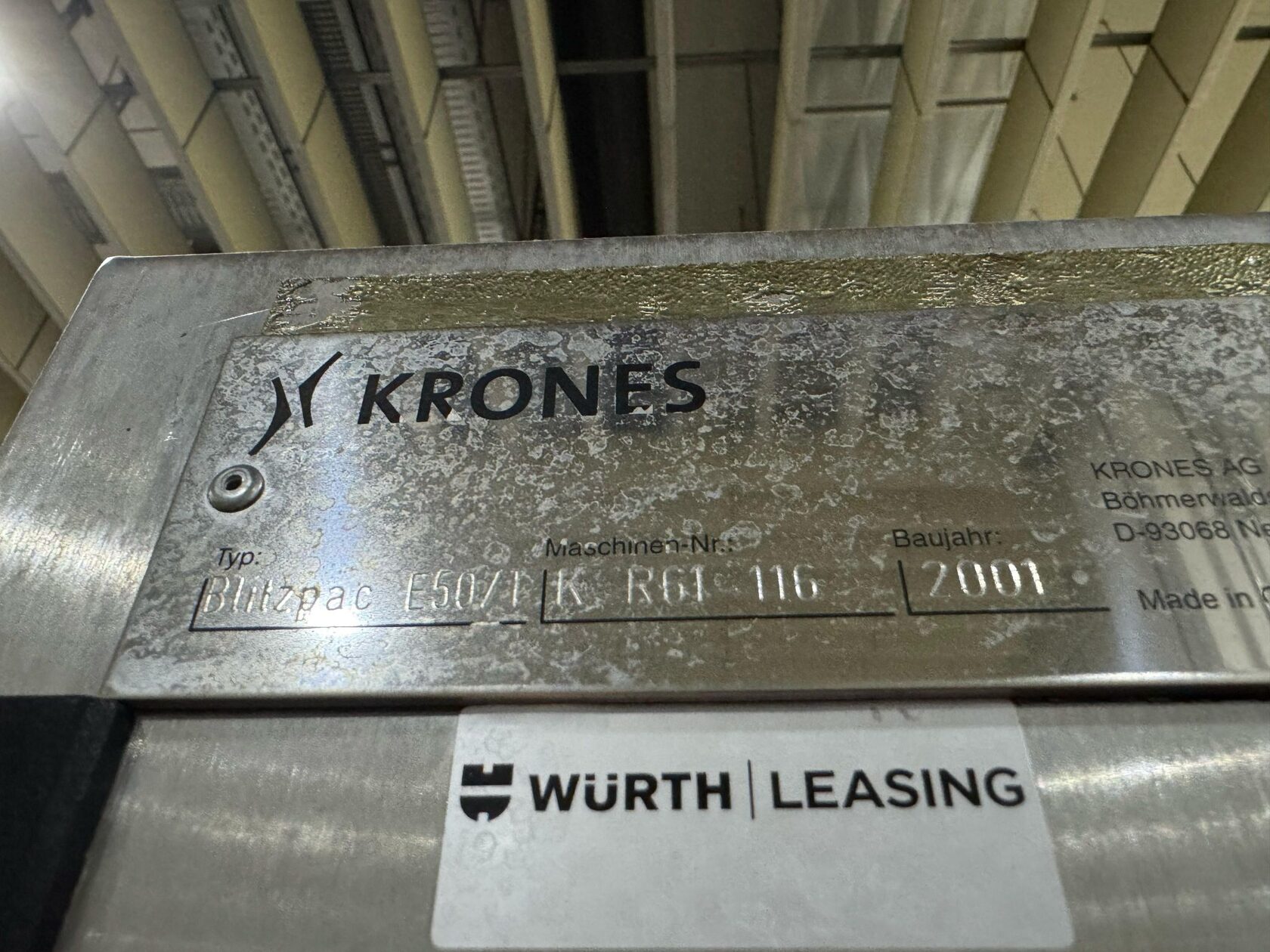 KRONES AG Kettner Blitzpack E50-T – High-Speed Crate Packer (Crater) for Beverage Lines The Kettner Blitzpack E50-T (legacy series from Kettner, now under KRONES AG support) is a robust automatic crate packer (Crater / Einpacker) designed for high-efficiency packing of bottles (glass/PET) into plastic crates in returnable and non-returnable beverage production lines. The "E50-T" variant (often from early 2000s builds, e.g., 2001) features T-execution (side/top feed or specific infeed configuration) for seamless integration in high-volume setups. Key Features & Benefits: