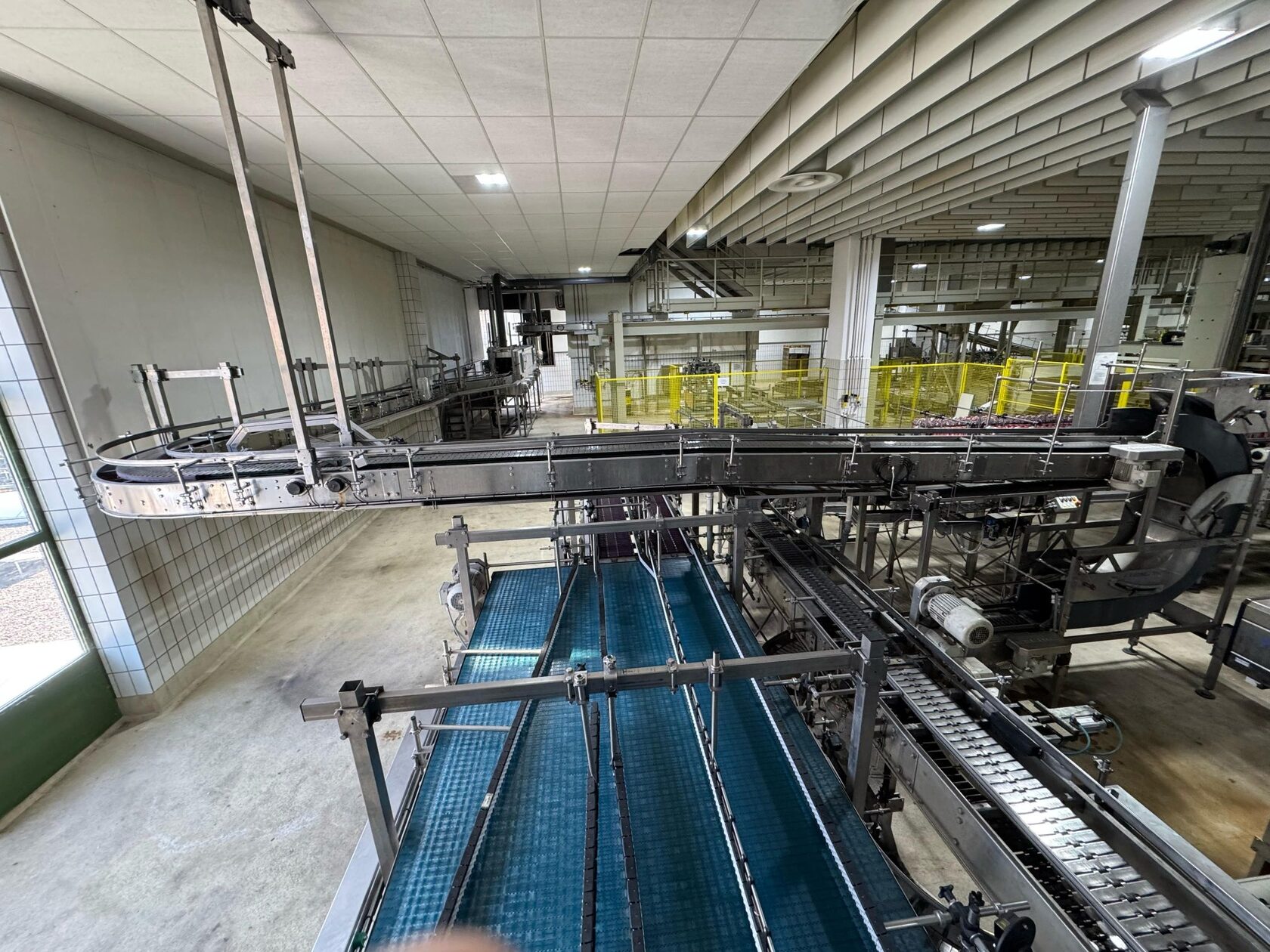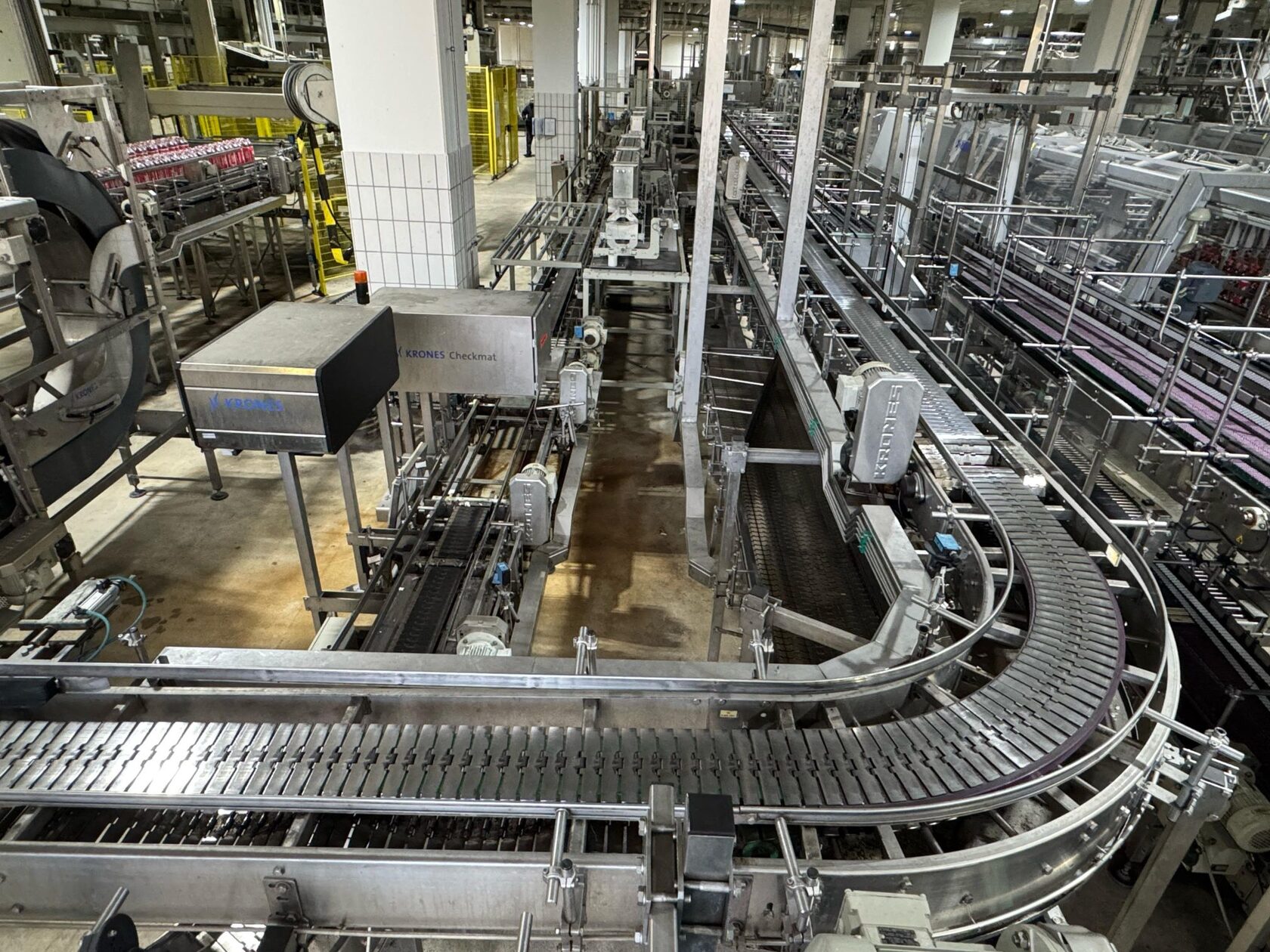 Crate transport system Krones consisting of link conveyors, various widths, with widths, with lateral guidance, total length approx. 80 m, year 2001.