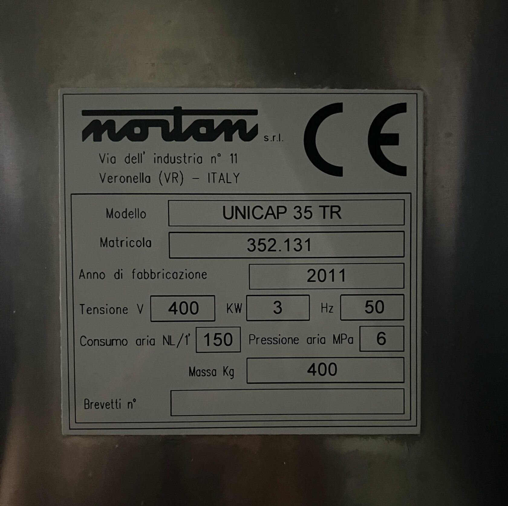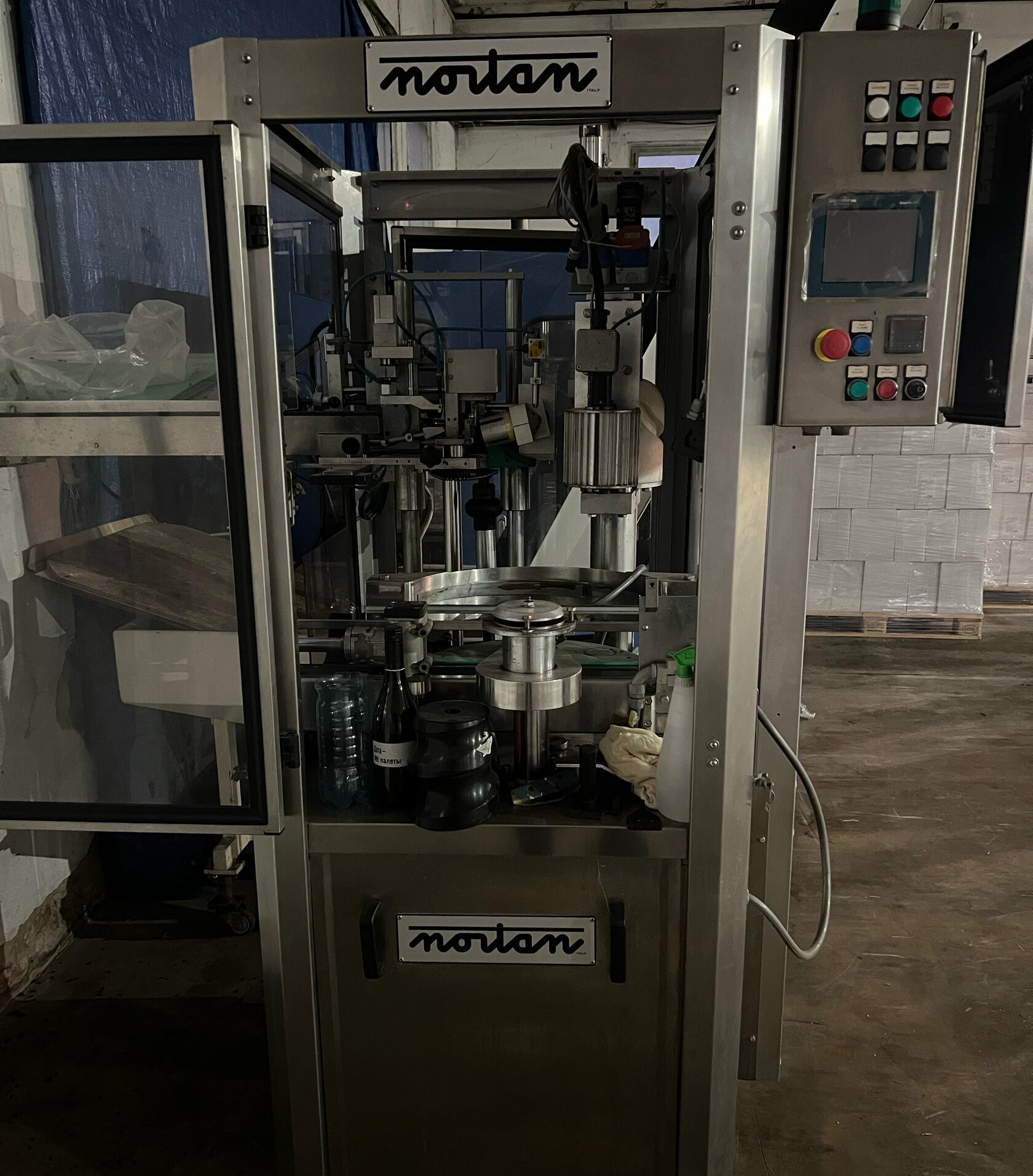 Nortan Capsule Bottle Cap Heat Shrinking Machine (2015) – Automatic Thermal Capsule Applicator & Shrinker for Wine & Beverage Bottles The Nortan heat shrinking machine (likely from models like Prisma with heat-shrink heads, Unicap series, or similar capsule applicators with integrated shrinking, e.g., Prisma or Syncrocap family) is a reliable automatic capsule applicator and thermal shrinking unit manufactured by Nortan S.R.L. (Italy), a specialist in capsuling, wire hooding (gabbiettatrici), and sleeve application for the bottling industry. Built around 2015, this machine applies PVC, tin, multi-rolled, or sparkling thermal shrinking capsules (also called thermocapsules or foil capsules) to bottle necks, followed by precise heat shrinking for a tamper-evident, professional seal. Key Features & Benefits: